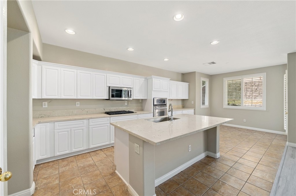 The kitchen is a true highlight, featuring a spacious layout and top-of-the-line upgrades. A large kitchen island with a center sink, pantry area, and breakfast nook provide ample space for meal preparation and casual dining. The kitchen cabinets have been replaced with modern ones, and sleek quartz countertops add a touch of elegance.
