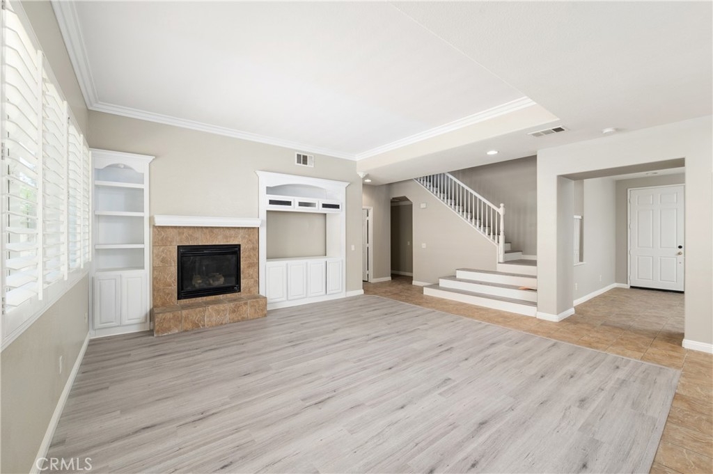 Upon entering, you'll be greeted by an abundance of natural light that flows throughout the home, highlighting the luxurious upgrades. The large family room boasts a built-in media center and a tiled fireplace, creating a cozy and inviting atmosphere. The interior has been freshly painted, giving the home a modern and refreshed look.