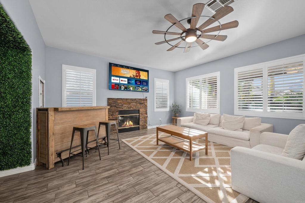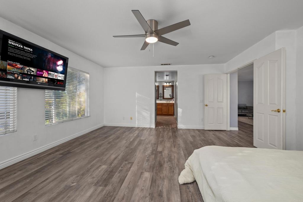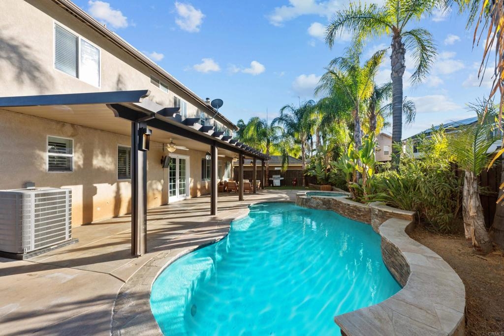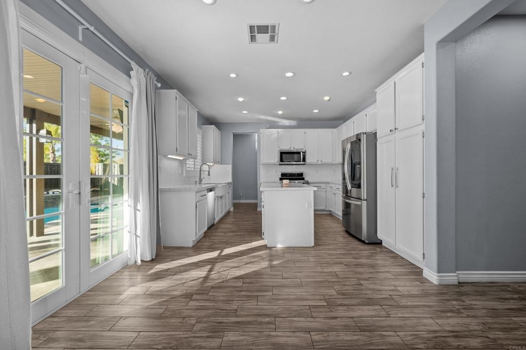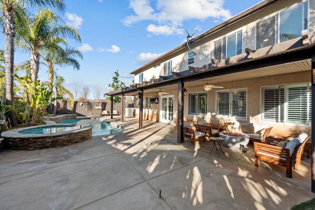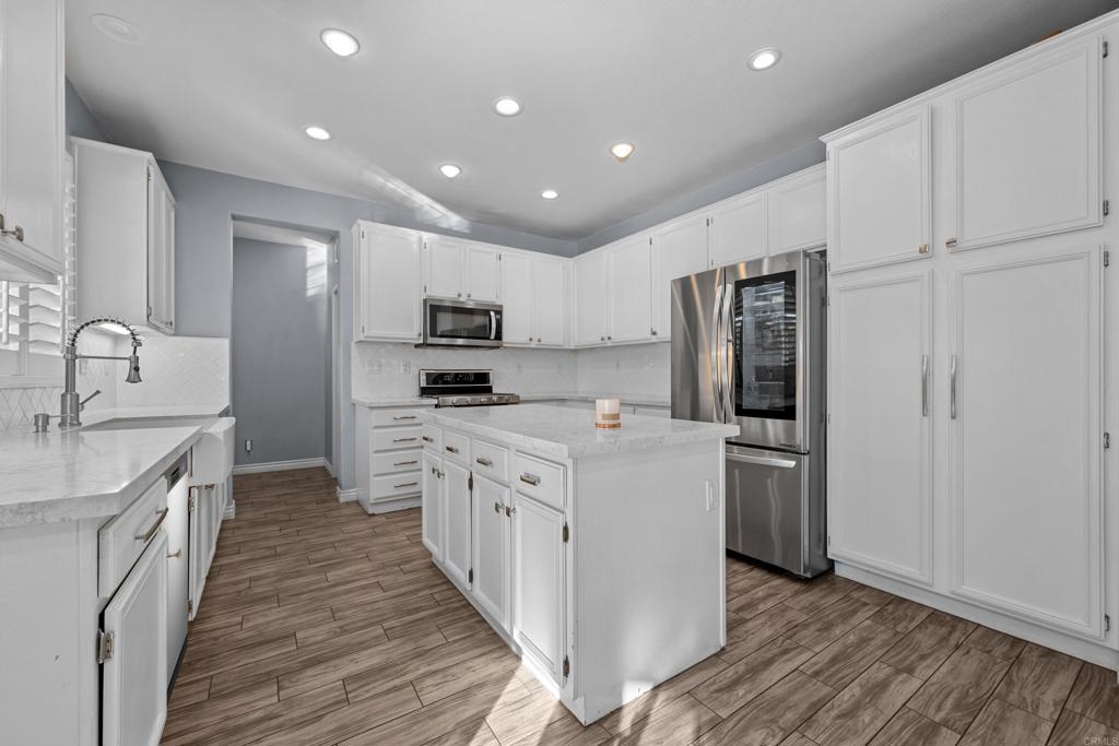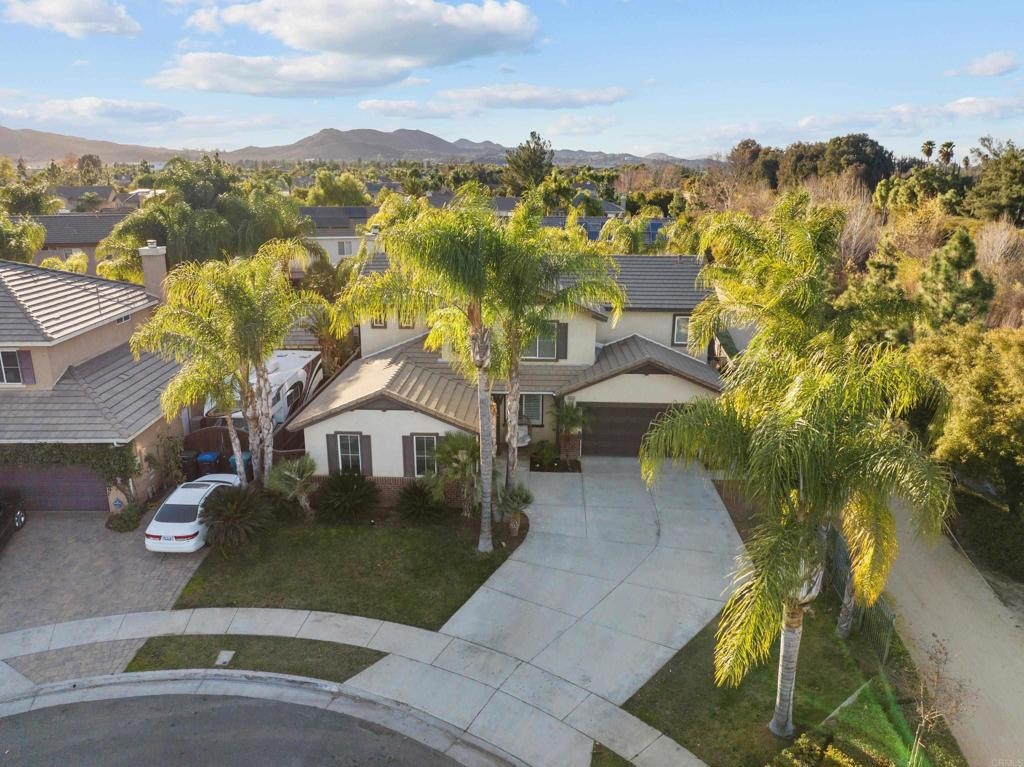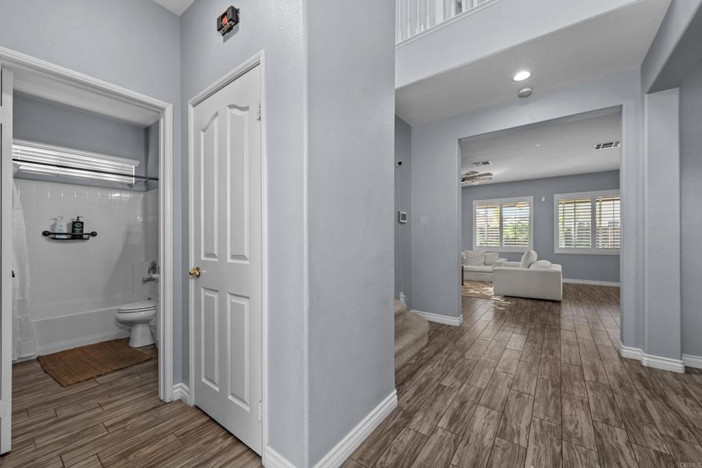 Welcome to this stunning entertainer’s dream home, nestled in the highly sought-after Mapleton community of Murrieta with NO HOA! Step inside to discover an inviting open floor plan with stylish grey wood-look tile flooring and upgraded baseboards throughout the main level. The bright and airy atmosphere flows seamlessly from the formal dining room to the spacious great room and stunning kitchen. The chef-inspired kitchen boasts pristine white Quartz countertops, a charming farmhouse sink, crisp white cabinetry, and sleek stainless steel appliances, making it the perfect space for both cooking and entertaining. The adjacent laundry room offers built-in cabinets and a utility room, in addition to this it features the convenience of a bedroom and full bathroom on the first level. Upstairs, you’ll find upgraded luxury vinyl plank flooring throughout, along with a large open loft area ideal for a home office or media space. The spacious master suite features a serene atmosphere, a walk-in closet, and a spa-like ensuite bath. Two additional guest bedrooms share a beautifully appointed guest bathroom, complete with granite countertops and elegant finishes. The backyard is truly an oasis, offering a sparkling pool and spa with a cascading fountain spillway, surrounded by lush tropical landscaping and a green artificial turf area. Two dog runs make it easy to care for your pets, while the expansive Alumawood patio cover provides ample shaded space to relax. The PAID SOLAR allows you to enjoy your pool and electric use without the worry of high costs. Located just blocks from schools, parks and minutes away from shopping, dining, and major healthcare providers like Loma Linda Hospital and Kaiser. Located at the end of a peaceful cul-de-sac with no neighbors on one side and adjacent to scenic nature trails, this gorgeous home offers both privacy and serenity.