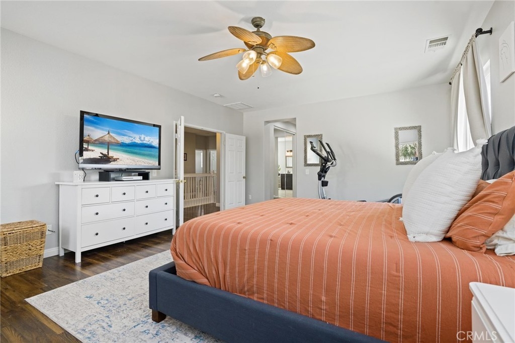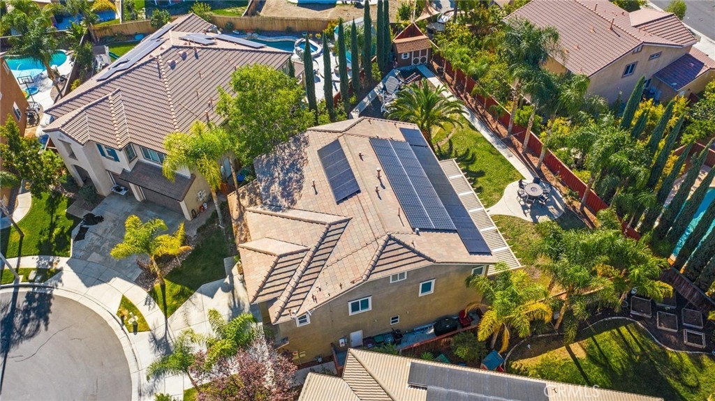 NO HOA, SOLAR, LARGE 9,000 SQFT POOL SIZE LOT, CUL-DE-SAC, MAIN FLOOR BATH, 5 SECOND STORY BEDROOMS, MAIN FLOOR OFFICE, FRUIT TREES, WORKSHOP SHED WITH ELECTRIC!! Welcome home to the most stunning, UPGRADED, 2 story, 5 bedroom, 3 bath home available in the highly desirable community of Mapleton. This 3200 sqft home was just updated with fresh interior and exterior paint, and freshly done landscaping. As you enter the property you are greeted by tall ceilings, recessed lighting, custom paint, upgraded floors throughout and a very desirable floor plan. The entrance of the home greets you with a beautifully done office space that was just updated with recess lighting and a large dining room area to fit everyone around the dining room table. The open concept floor plan features a large great room boasting a gas fireplace, large windows allowing tons of natural light, a cutout entertainment space perfect for built-ins and is open to the freshly painted kitchen. The kitchen is finished with white cabinets, double oven, 5 burner gas stove, granite countertops and granite backsplash, kitchen island with eat up bar and walk in pantry. Also on the main floor is a shower/tub combo with single vanity, a laundry room with wash sink, storage closet and access to the 3 car garage. The garage features tons of extra storage. The second story features new paint, 5 bedrooms, storage cabinet, and a BONUS room that could be utilized as the 6th bedroom. The four secondary bedrooms are large with beautiful hardwood floors, sliding door closets and ceilings fans. The massive master bedroom is so large it can fit your largest pieces of furniture, including workout equipment and a sitting area, big windows allowing tons of natural light, one sliding door closet and one large walk in closet, attached master bath boasting a soaking tub, standing shower, dual vanity. The entertainers yard features a new large alumawood patio cover with 2 ceiling fans, wrap around sidewalks, workers shed with electricity, a playground for the kids and side yard for the adults to relax with enough room to build a custom pool and spa. The yard also features fruit trees including apple, peaches, yellow guava, orange, apricot and tons of freshly manicured palms and cypress trees that line the back yard, creating your own private oasis. Walking distance to Oak Meadows Elementary, short drive to the 215, and located central to Menifee and Murrieta. You do not want to miss the opportunity to own this beauty!