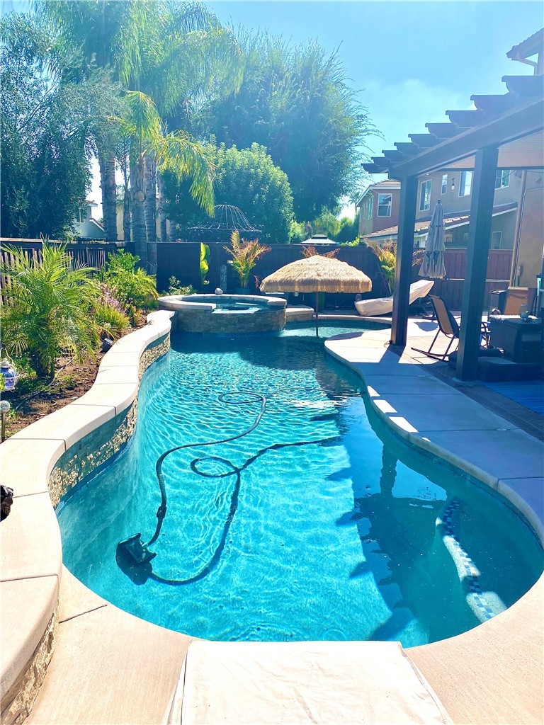 Beautiful 2 story MURRIETA POOL/SPA home located on a quiet cul-de-sac. NO HOA!! 4 bedrooms + Loft (main floor bedroom perfect for older relatives or guests.)As you enter the home you are greeted by the upgraded Luxury Vinyl Plank Flooring, neutral paint, plantation shutters and lots of natural light. To the right of the entry is the formal dining room with views of the front yard. To the left of the entry is the main floor bedroom (no closet) and bathroom with tub/shower combo. The living room features a gas fireplace, media niche and closet for extra storage. The kitchen is perfect for the chef in the family with stainless steel appliances, granite counters, and pendent lighting above the kitchen island. A butlers pantry is around the corner leading to the formal dining room. Just off the kitchen is the office and laundry room with sink which leads to the 2 car garage. Additional 3rd car garage has a separate entrance. Upstairs boasts new carpet and a large loft with ceiling fan. The master suite includes a double door entrance, ceiling fan and views of the gorgeous backyard. The master bathroom features dual sinks, a large soaking tub, separate shower and walk-in closet with built-ins. Down the hall are 2 more bedrooms and a bathroom with dual sinks and tub/shower combo. Outback is an amazing oasis with pebbletec pool and spa, alumiwood patio cover, built-in bbq island with bar seating, lush landscaping and stamped concrete patio. ADDITIONAL UPGRADES: Surround sound throughout home, Whole house fan, Newer AC unit and furnace. The Mapleton Community is located close to schools, shopping centers and freeway access. Minutes from Temecula wineries.