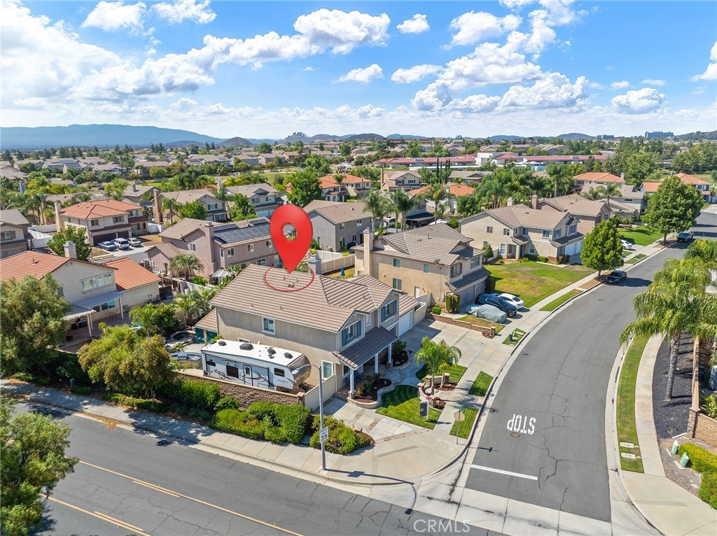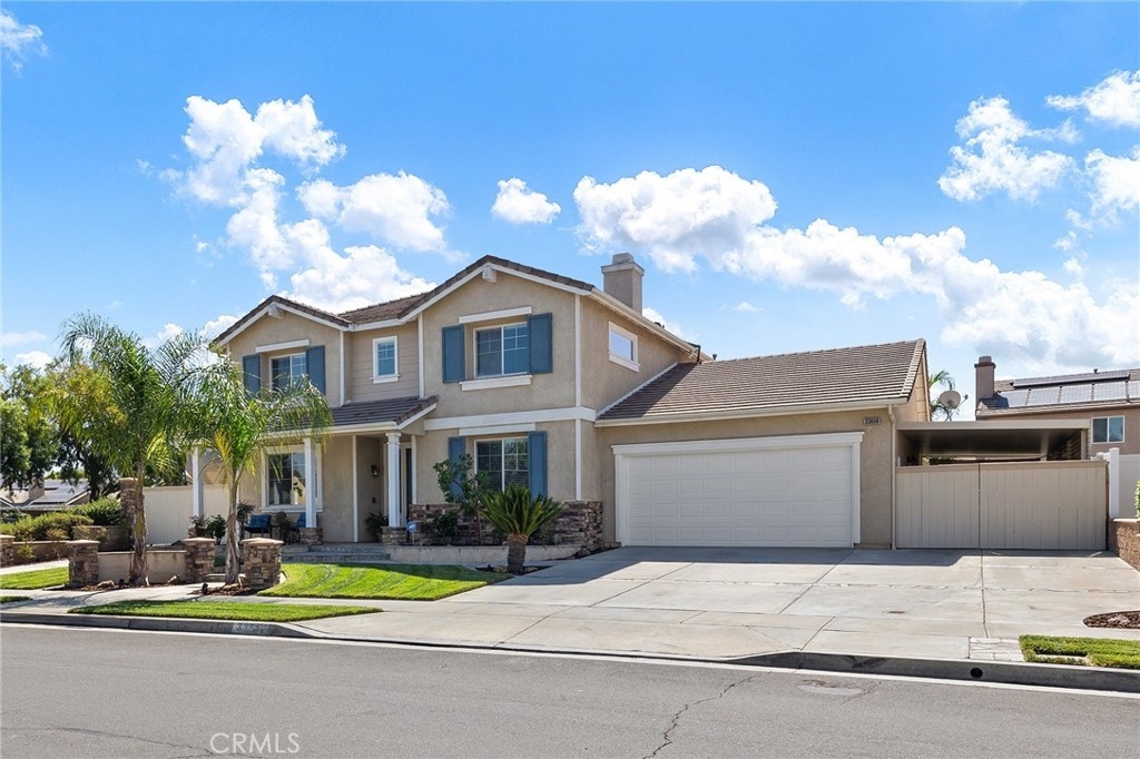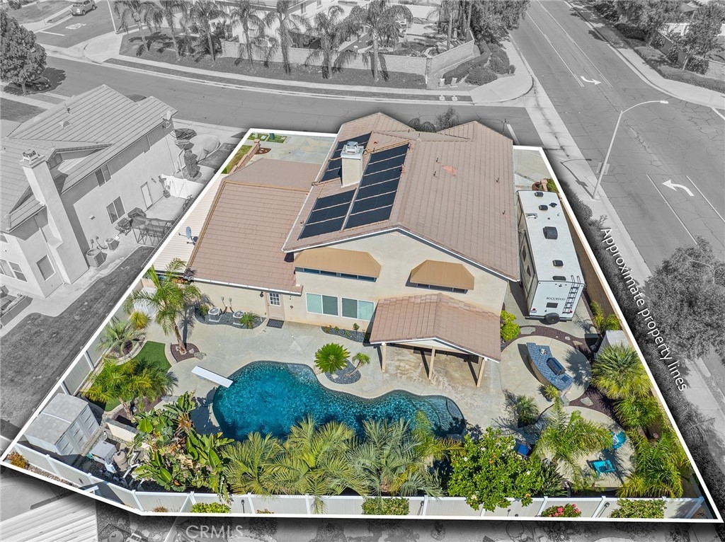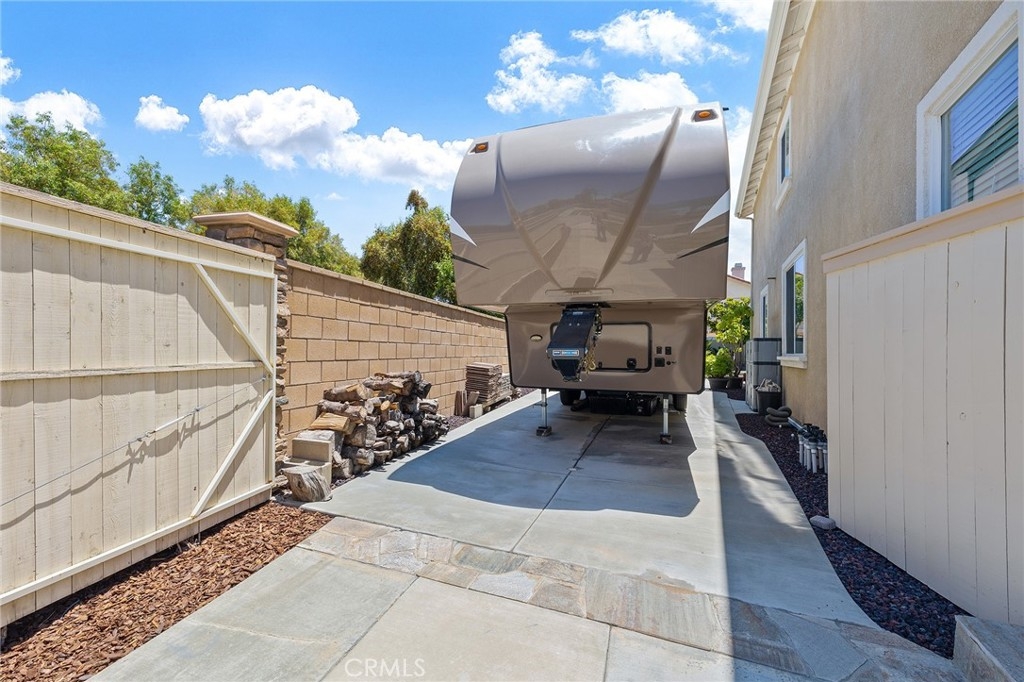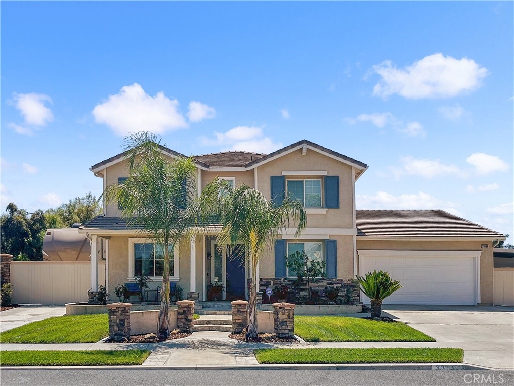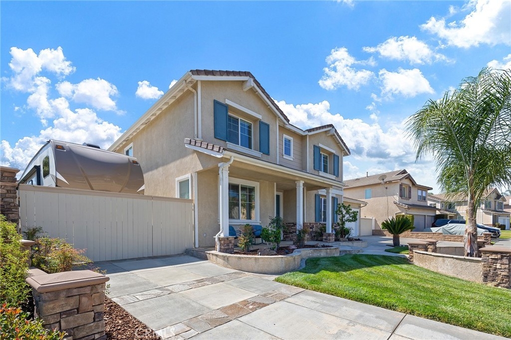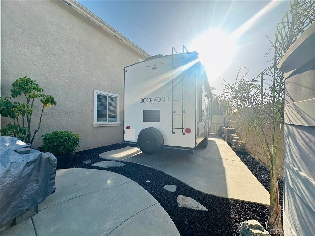 This home has it all! It is a car enthusiast's dream with an entertainer's dream backyard! A four car garage, double RV parking, covered RV parking, Barbecue island and a gorgeous pool and spa make this home a rare find! From the moment you arrive, this immaculately maintained corner lot home oozes curb appeal! The front yard features beautifully designed landscaping, an extended driveway for a total of 10+ car parking, resulting in extra wide road frontage and no neighbors directly across. There are also two RV Parking areas, one is the RV carport (92" plus) with access on the right side of the garage, and the second RV parking is 14' wide by 34' long with sewer cleanout and electrical outlet. The interior of the home offers 4 bedrooms and 3 bathrooms with a bedroom and full bath downstairs. Upstairs you will find a large game room loft, a primary bedroom with ensuite bathroom and upgraded closet, and two oversized secondary bedrooms with a Jack and Jill bathroom. The interior has been meticulously painted and upgraded with neutral tone paint, commercial grade luxury vinyl plank flooring, recently installed carpet, upgraded baseboards and window treatments. The laundry room is equipped with a utility sink and extra cabinet space and it is located off the 4 car which has extra cabinets which is perfect for a workshop or man cave! The bright kitchen with extra long island welcomes you through extra wide sliding doors into the gorgeous tropical backyard where you can enjoy the shade of the cathedral patio cover or jump from the diving board into the sparkling pool featuring depths of up to 8.5 feet, flagstone and rock coping and a gorgeous rock waterfall! You can also enjoy the spa while cooking in the barbecue island/outdoor kitchen area. This gorgeous backyard includes full landscaping with mature palm trees and tropical plants, fire pit with seating area, direct access to RV area & workshop, and solar pool heating as well as an outdoor shower! To add even more convenience, the Mapleton community offers a park with playground, sports courts, RC car track and a nature preserve with hiking trails with NO HOA and amazingly located a couple of minutes from hospitals, shopping and dining!
