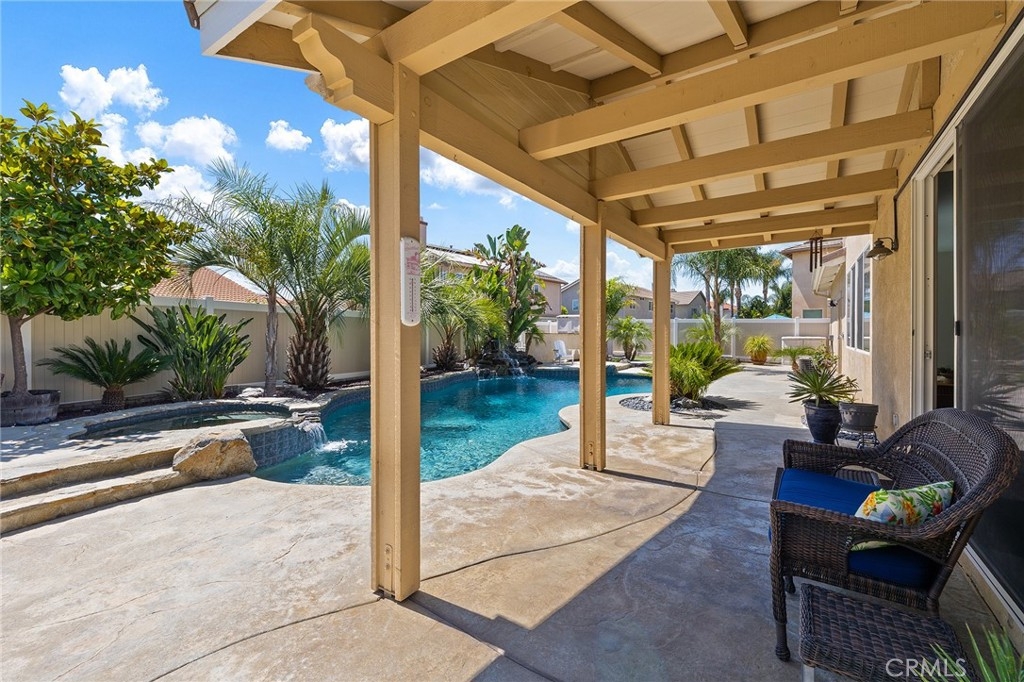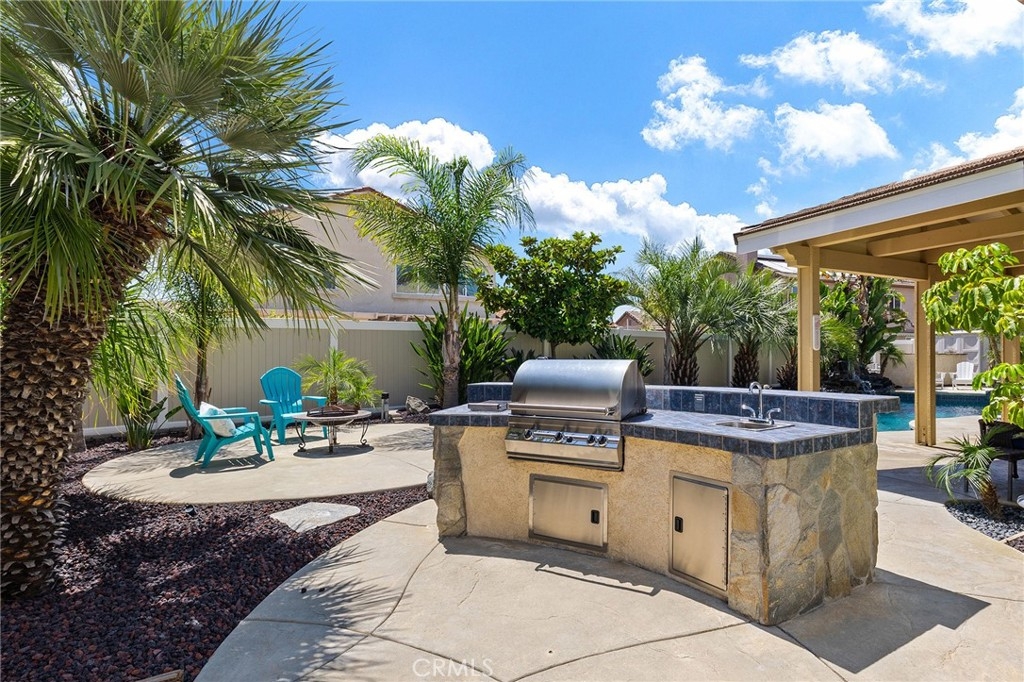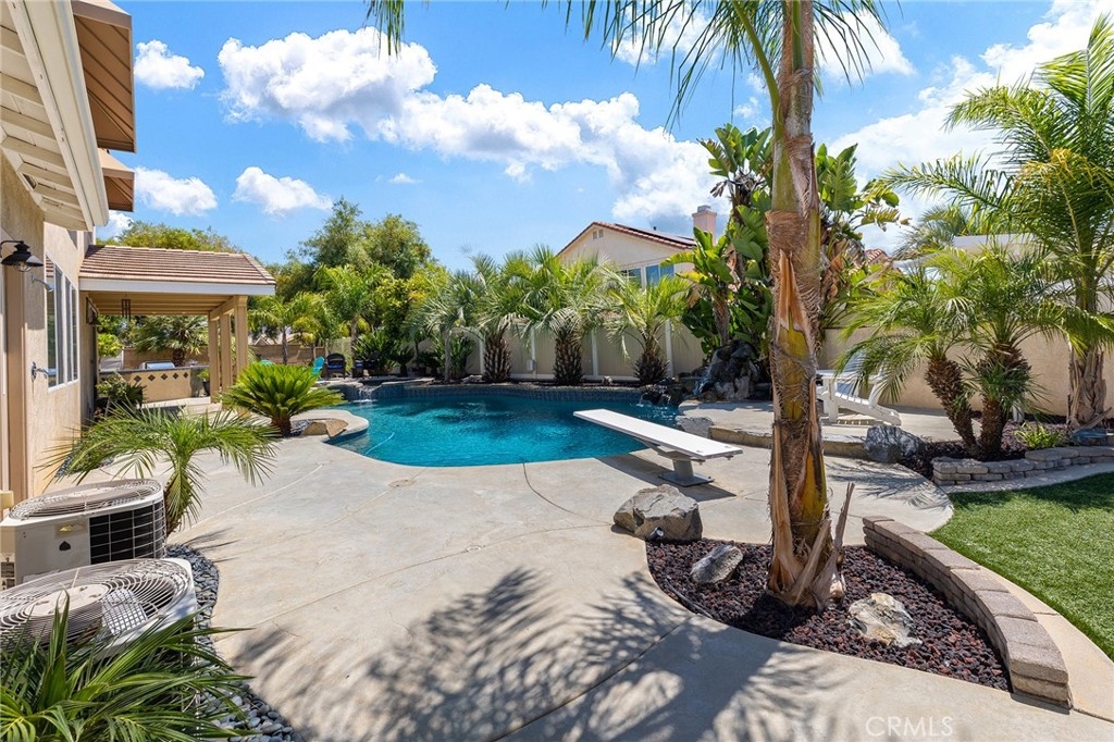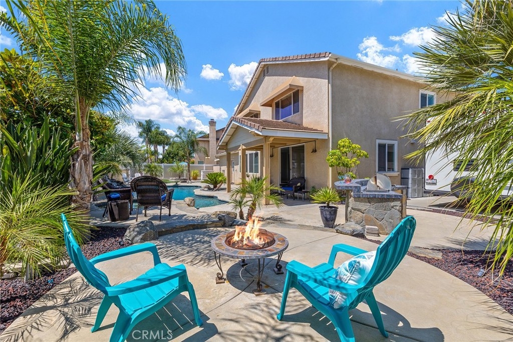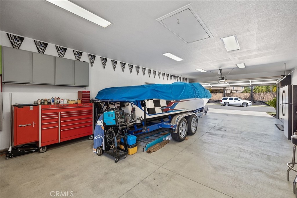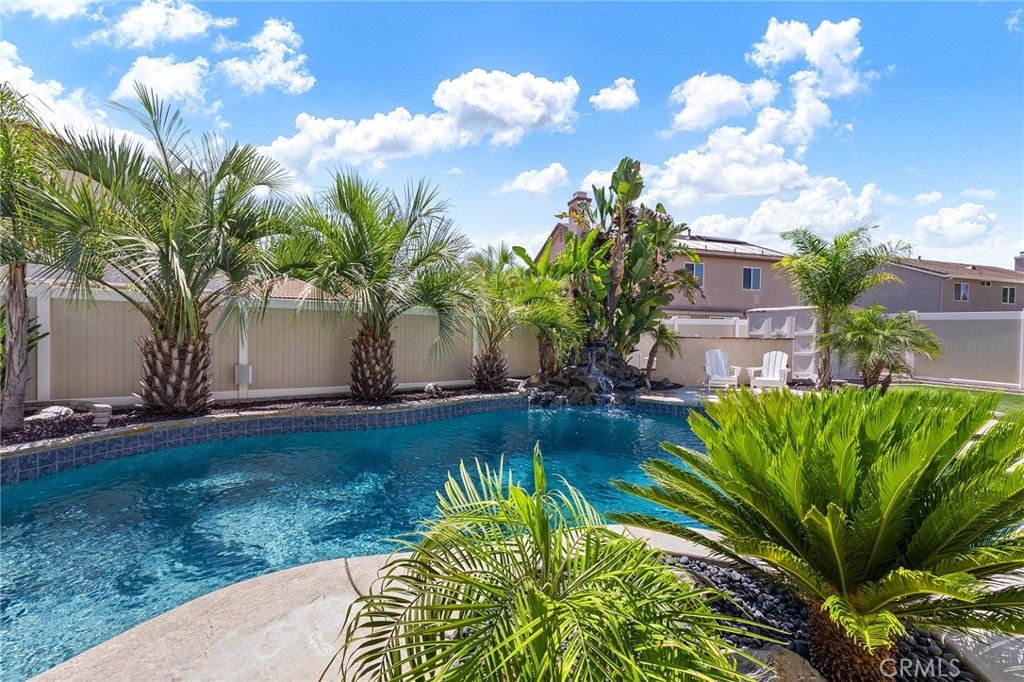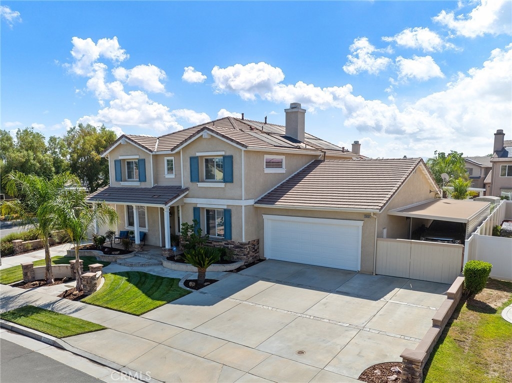 This home has it all! It is a car enthusiast's dream with an entertainer's dream backyard! A four car garage, double RV parking, covered RV parking, Barbecue island and a gorgeous pool and spa make this home a rare find! From the moment you arrive, this immaculately maintained corner lot home oozes curb appeal! The front yard features beautifully designed landscaping, an extended driveway for a total of 10+ car parking, resulting in extra wide road frontage and no neighbors directly across. There are also two RV Parking areas, one is the RV carport (92" plus) with access on the right side of the garage, and the second RV parking is 14' wide by 34' long with sewer cleanout and electrical outlet. The interior of the home offers 4 bedrooms and 3 bathrooms with a bedroom and full bath downstairs. Upstairs you will find a large game room loft, a primary bedroom with ensuite bathroom and upgraded closet, and two oversized secondary bedrooms with a Jack and Jill bathroom. The interior has been meticulously painted and upgraded with neutral tone paint, commercial grade luxury vinyl plank flooring, recently installed carpet, upgraded baseboards and window treatments. The laundry room is equipped with a utility sink and extra cabinet space and it is located off the 4 car which has extra cabinets which is perfect for a workshop or man cave! The bright kitchen with extra long island welcomes you through extra wide sliding doors into the gorgeous tropical backyard where you can enjoy the shade of the cathedral patio cover or jump from the diving board into the sparkling pool featuring depths of up to 8.5 feet, flagstone and rock coping and a gorgeous rock waterfall! You can also enjoy the spa while cooking in the barbecue island/outdoor kitchen area. This gorgeous backyard includes full landscaping with mature palm trees and tropical plants, fire pit with seating area, direct access to RV area & workshop, and solar pool heating as well as an outdoor shower! To add even more convenience, the Mapleton community offers a park with playground, sports courts, RC car track and a nature preserve with hiking trails with NO HOA and amazingly located a couple of minutes from hospitals, shopping and dining!