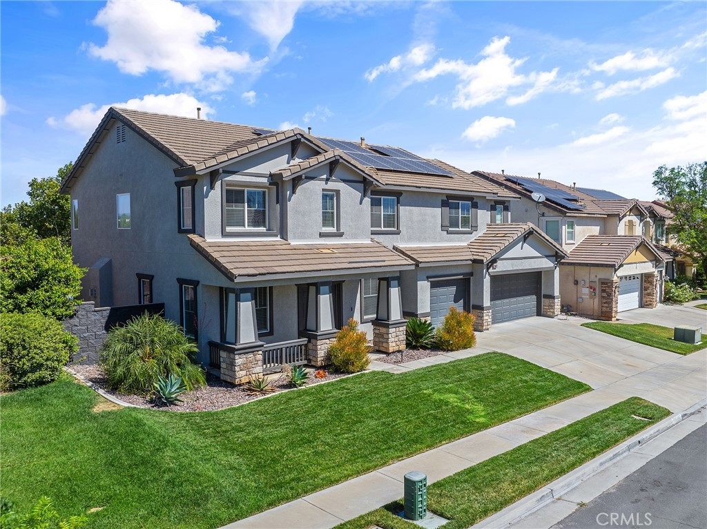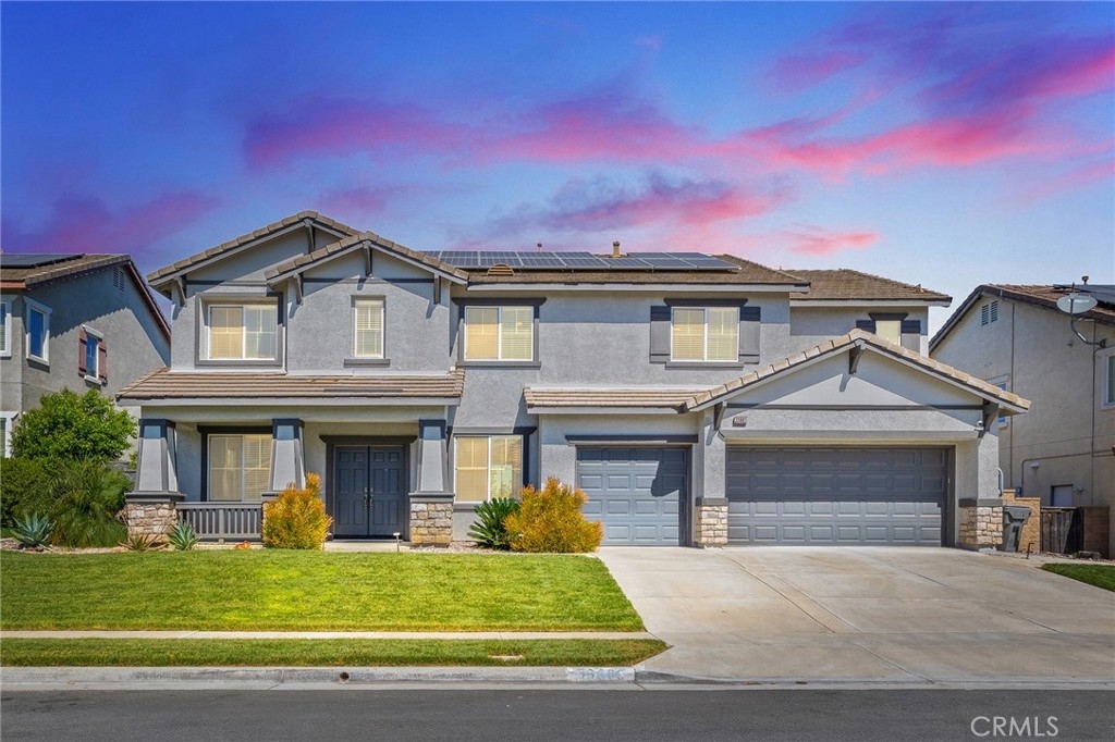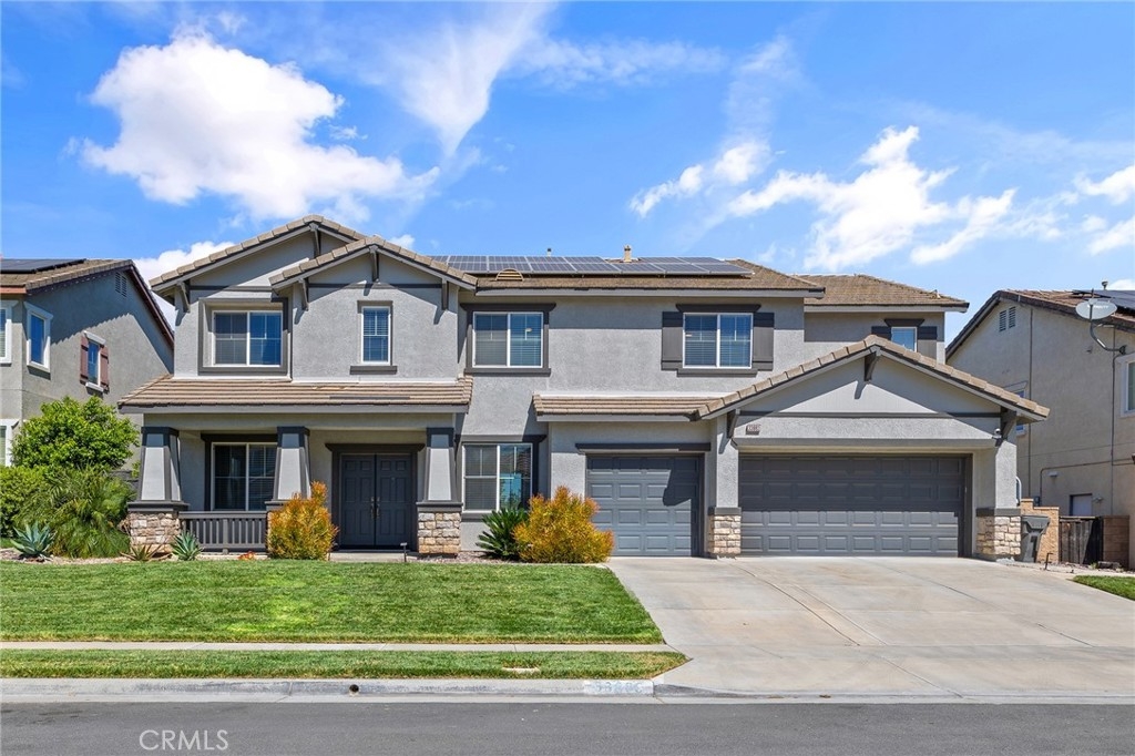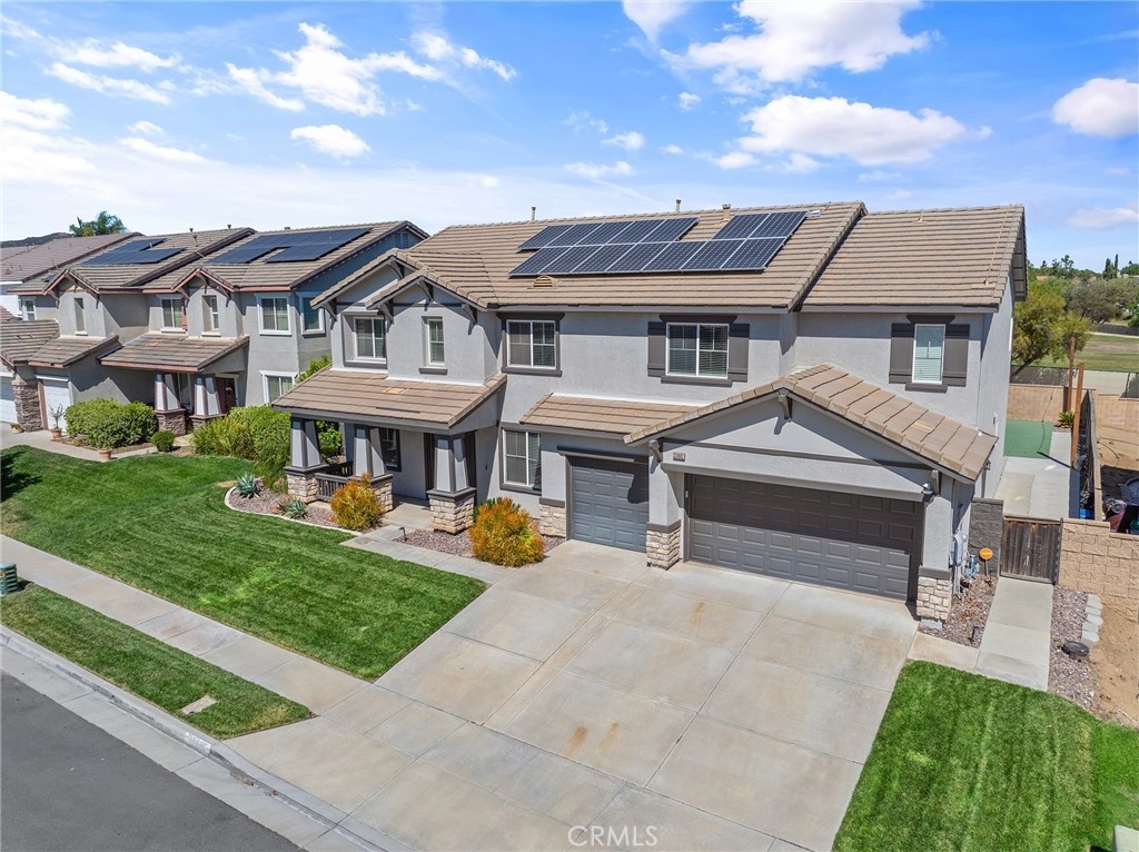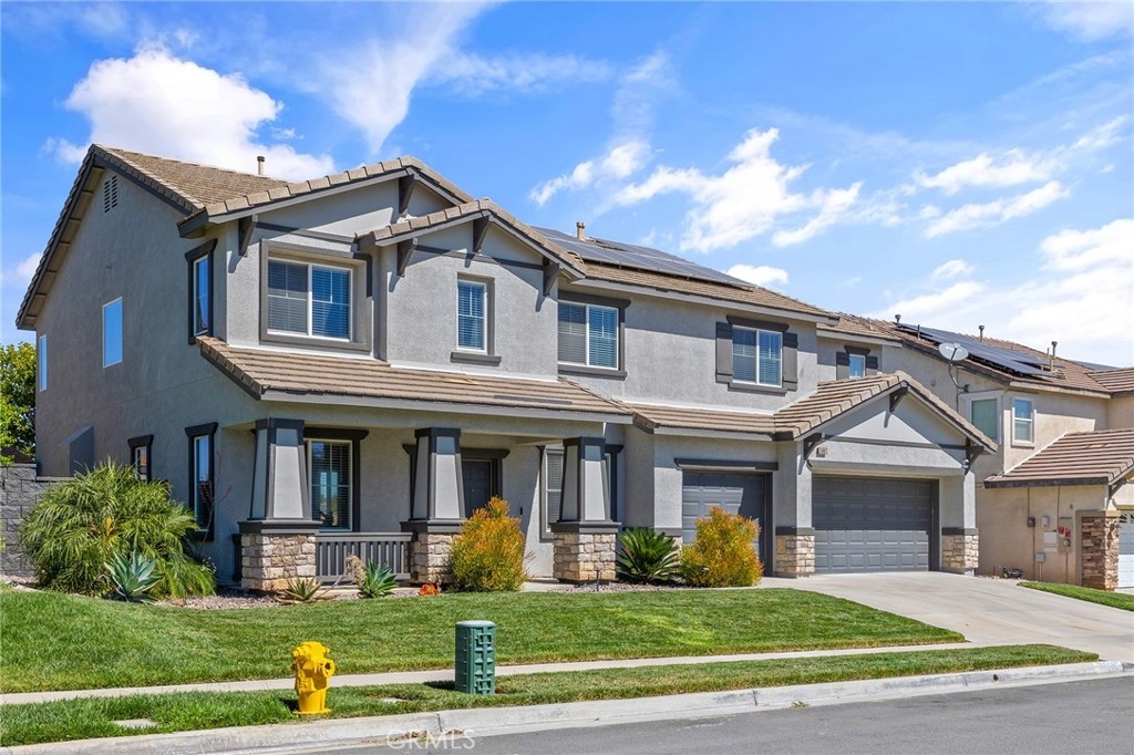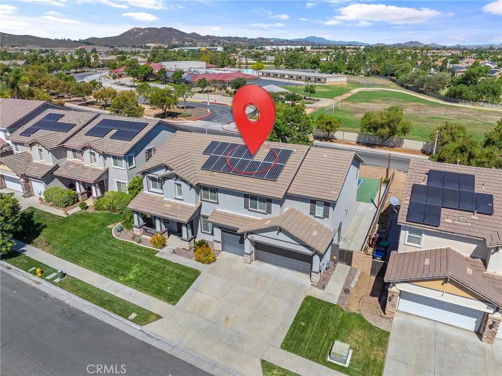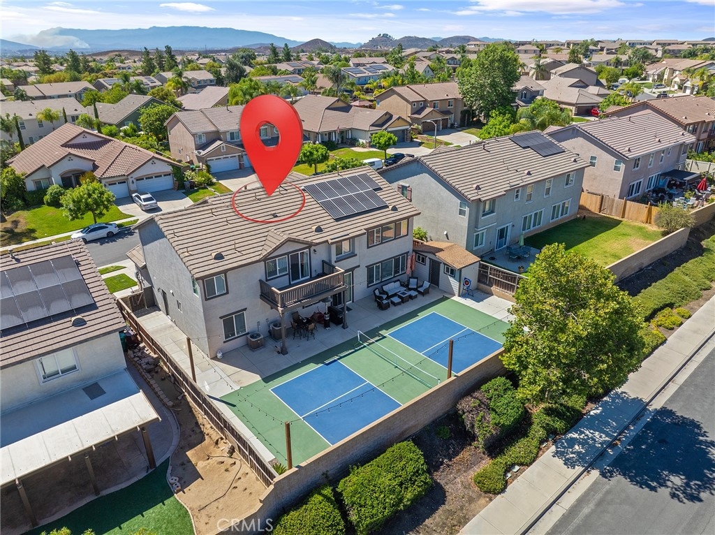 Stunning Mapleton Community Home - No HOA and PAID OFF SOLAR PANELS! Discover exceptional living in this beautifully appointed 5-bedroom, 3-bathroom home with 3-car garage, nestled in Murrieta's desirable Mapleton Community. This property offers outstanding curb appeal and sits on a large lot with complete privacy—no rear neighbors! Step through the front door into elegant formal living and dining rooms that set the tone for this impressive home. The heart of the house features a spacious kitchen with a large island, butler's pantry overlooking the formal dining room, and premium stainless steel appliances including a new dishwasher, oven, built-in microwave, and gas range stovetop. The kitchen flows seamlessly into the expansive family room, complete with a cozy fireplace—perfect for entertaining. A convenient downstairs bedroom and full bathroom provide flexible living options, while the downstairs laundry room adds everyday convenience. The second level houses three secondary bedrooms, including one with a jack-and-jill bathroom configuration. The oversized master suite is a true sanctuary, featuring an owner's retreat area and a sliding glass door opening to a generous balcony with great views. The luxurious master bathroom includes a separate shower, bathtub, dual vanities, and an enormous walk-in closet. An upstairs bonus room offers endless possibilities—transform it into a home theater, game room, or even a sixth bedroom to suit your lifestyle. Enjoy year-round comfort with a brand new 2024 HVAC system featuring high-efficiency climate control and advanced filtration for optimal indoor air quality. Experience ultimate energy independence with fully owned solar panels that reduce electricity bills to almost nothing while providing clean, renewable energy—no monthly lease payments and protection against rising utility costs for years to come! The backyard is an entertainer's dream, featuring a pickle ball/sport court, large storage shed, and extensive outdoor lighting with plenty of electrical outlets. The private setting with no rear neighbors ensures peaceful enjoyment of your outdoor space. This home has been meticulously maintained with newly installed blinds throughout and ceiling fans in every room, ensuring comfort and style in every space. Experience the perfect blend of luxury, functionality, and privacy in this exceptional Mapleton Community home—all without HOA restrictions!